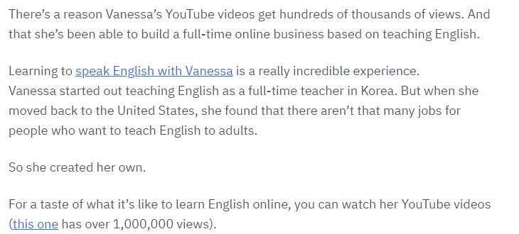 베네사는 한국에서 풀타임 영어교사를 했는데 미국에 다시 돌아왔을 때 그 곳에서 성인영어를 가르칠 수 있는 직업이 그렇게 많지 않은것을 느꼈다. 그래서 스스로 컨텐츠를 만들기로 했다.