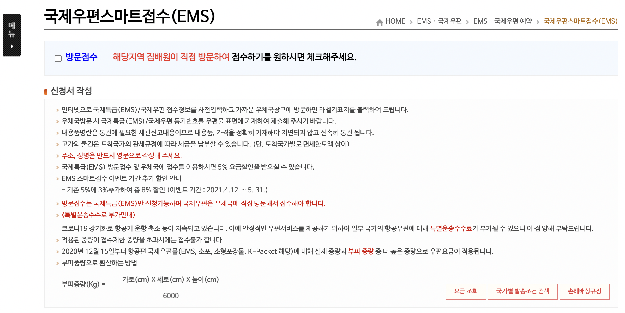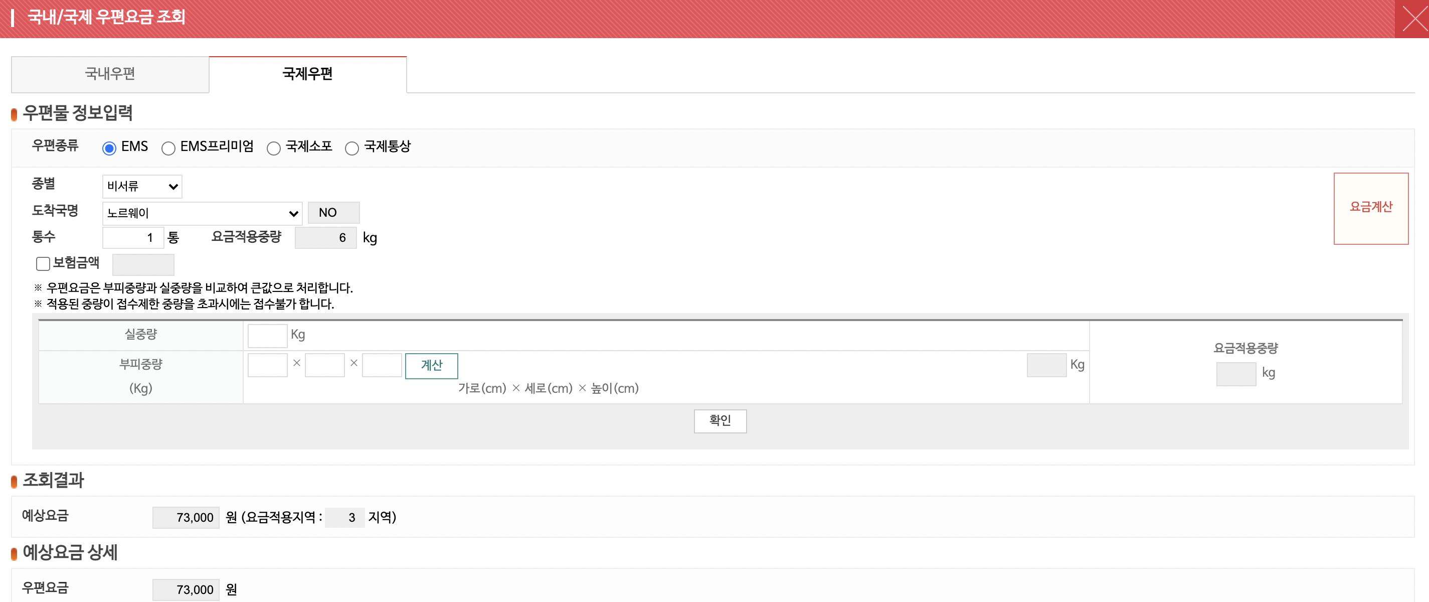 이렇게 실중량, 부피중량만 알면 아래 사이트에서 EMS 국제항공 배송비를 미리 검색할 수 있다.