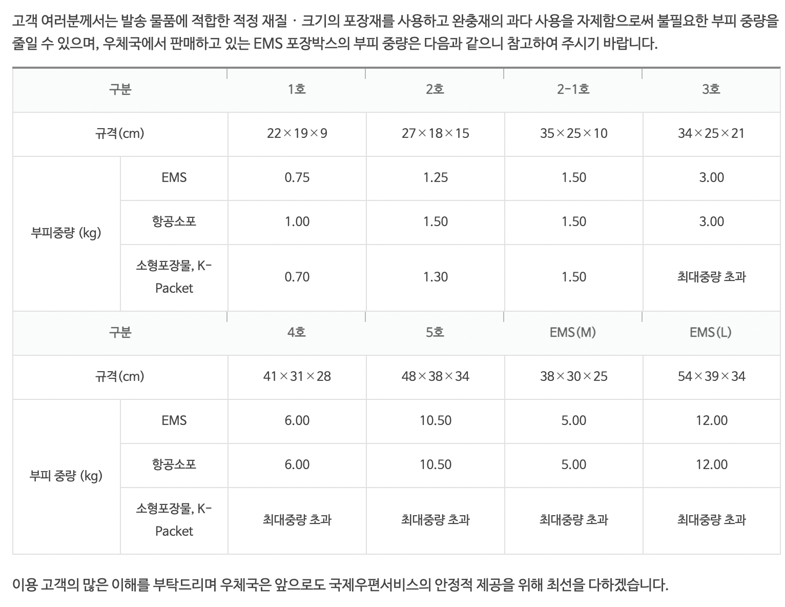 항공편 국제우편물 (EMS, 소포, 소형포장물, K-Packet 해당)에 대해 실제 중량과 부피 중량 중 더 높은 중량으로 우편요금이 적용된다.