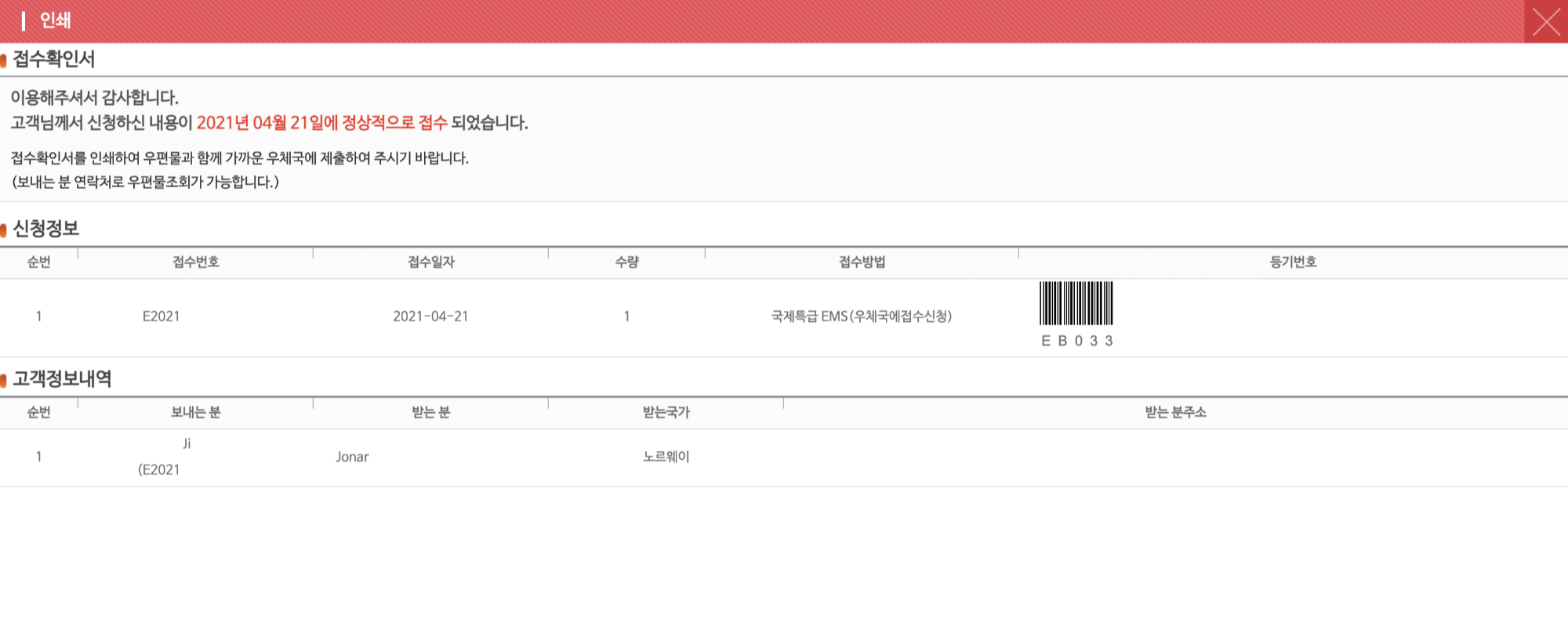 받는 분 Country 검색을 누르고 노르웨이를 클릭하면 설정이 되고 나머지 이하 주소를 쓰면 된다.
