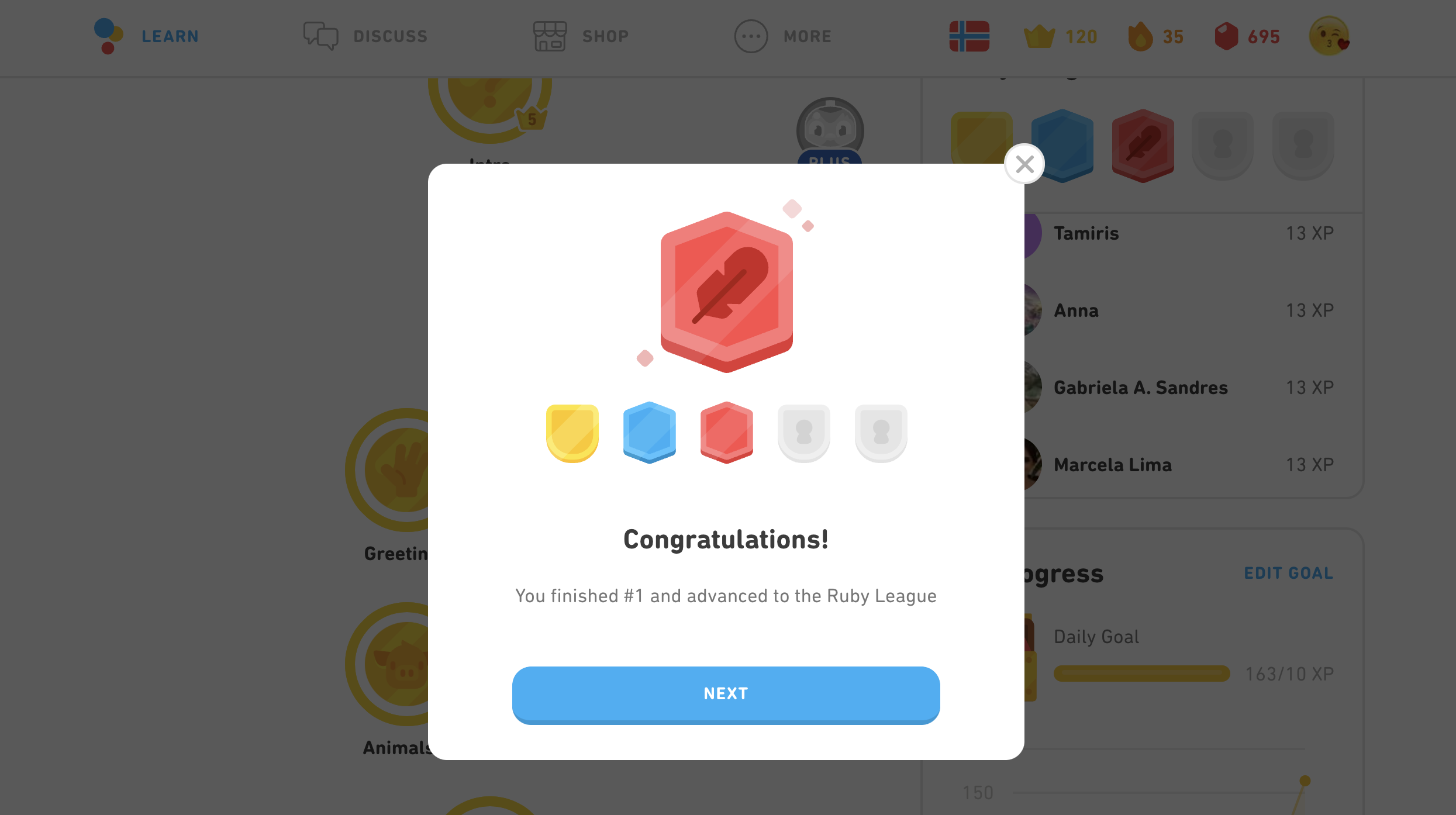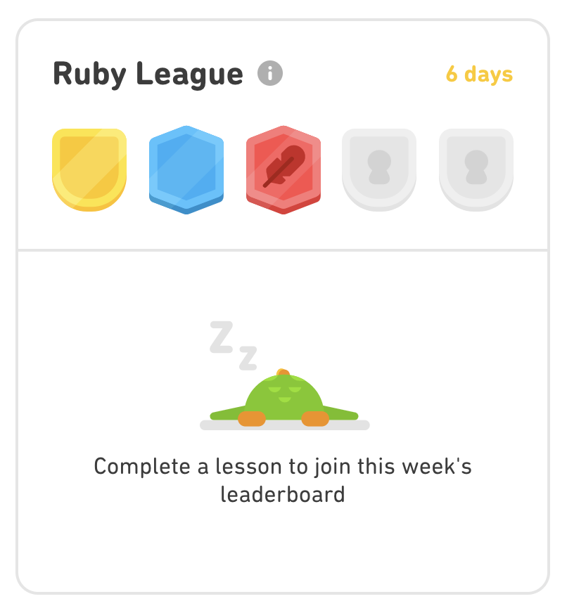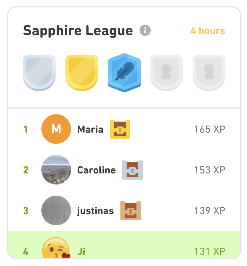 유저들이 외국어 공부를 하면 점수를 얻게된다. 한 챕터를 끝낼 때마다 약 10XP 정도 얻을 수 있다.