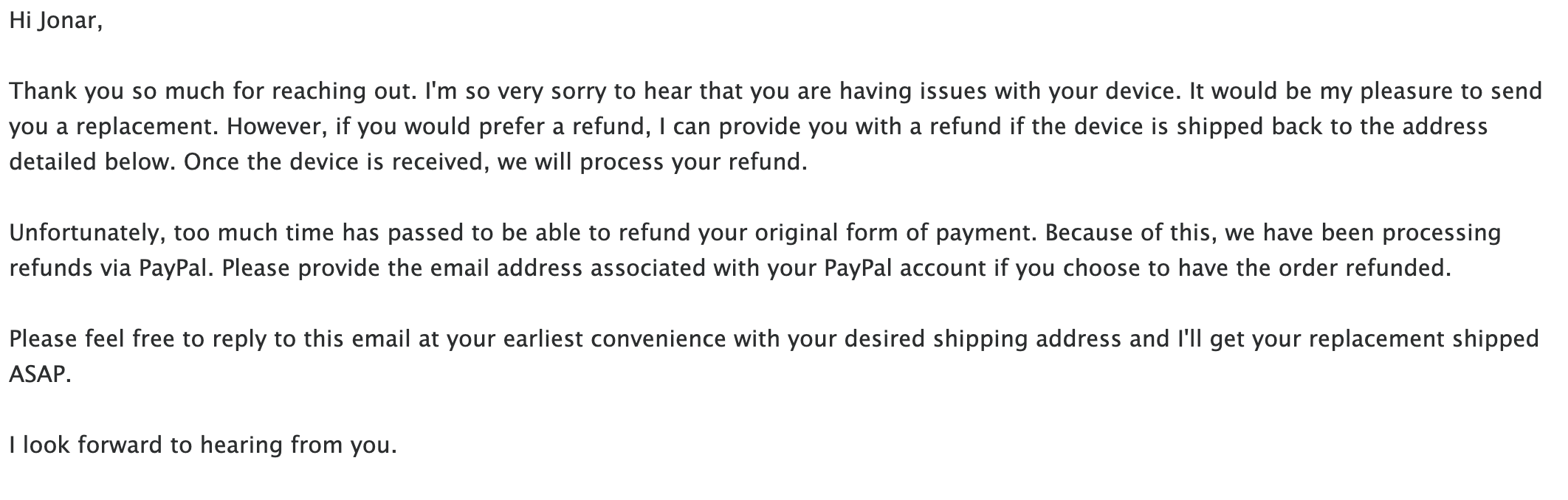 펀딩으로부터 시간이 많이 지났기 때문에 페이팔로 환불해줄 수 있다. 페이팔 계정과 아이디 필요.