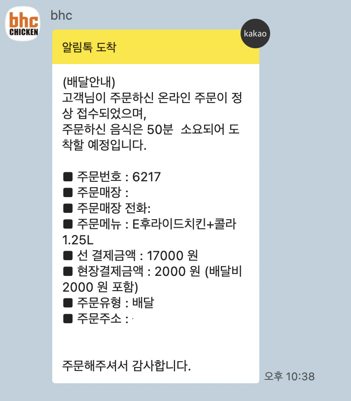 주문정보가 카톡으로 다시 알림창이 온다.