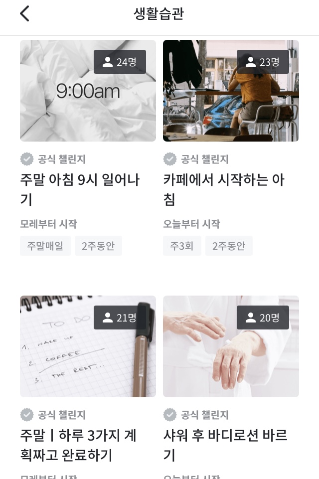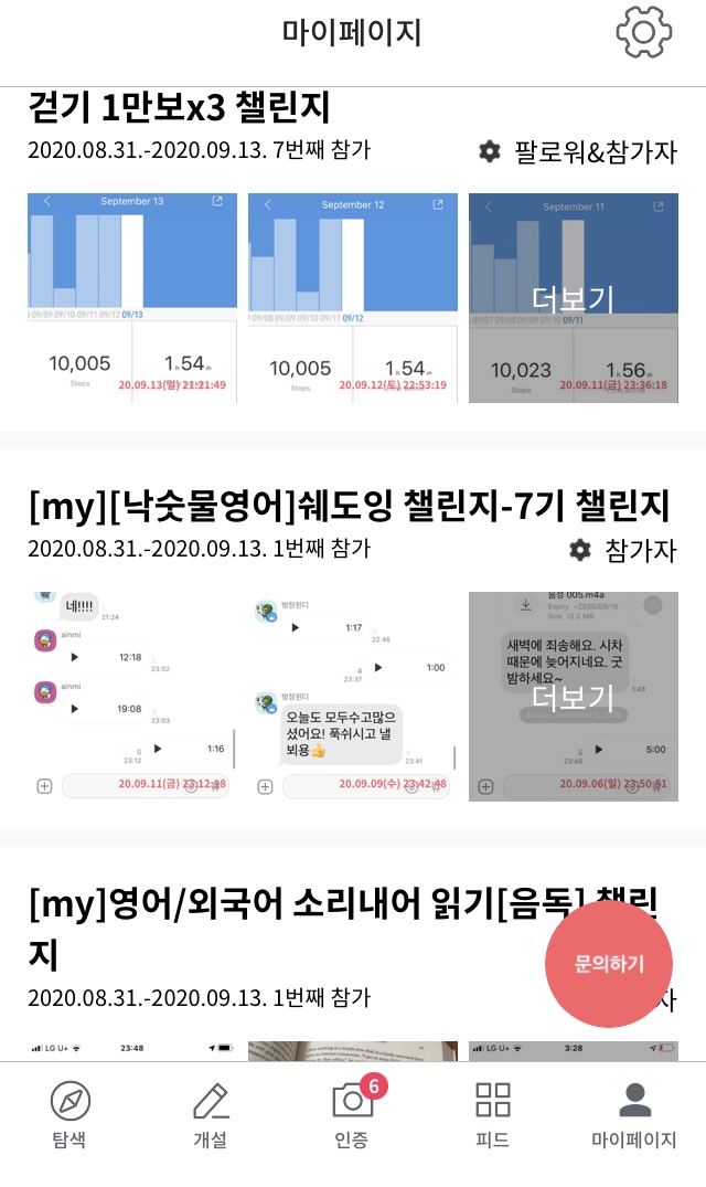 마이페이지에 가면 내가 그동안 했던 챌린지들을 볼 수 있다. 인스타 피드처럼 쭉 모아볼 수 있으니 뿌듯하기도 하다.