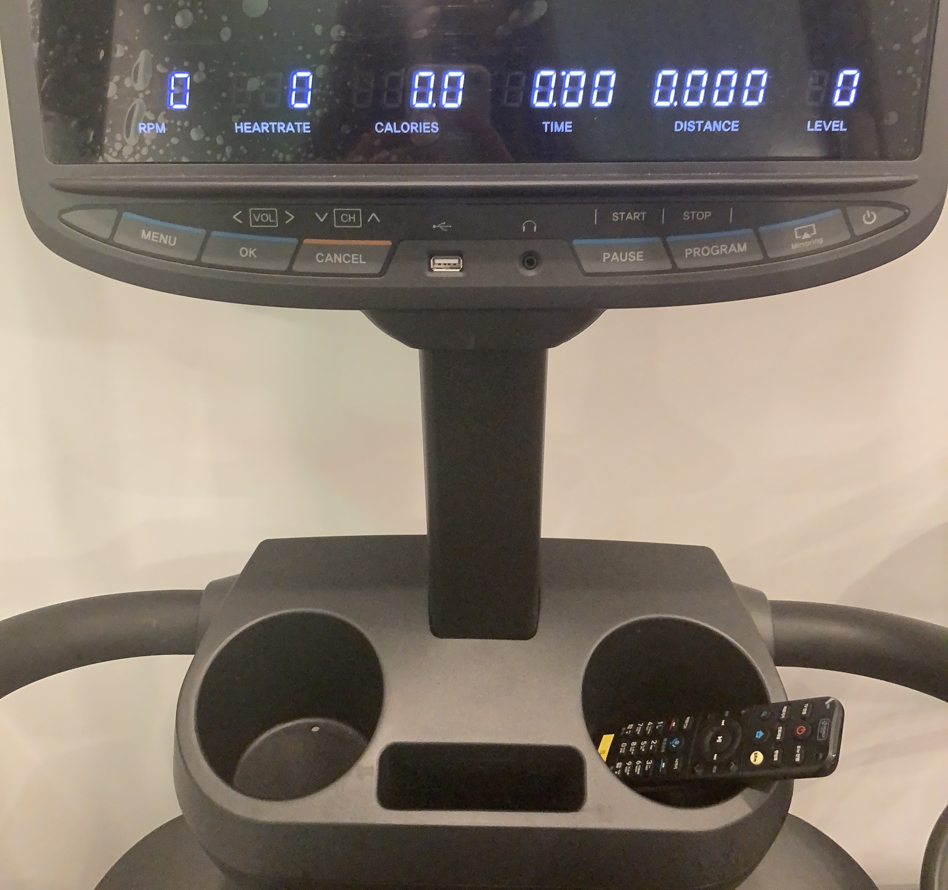 RPM, 심박수, 칼로리, 타임, 거리, 강도 등이 표시되어있다