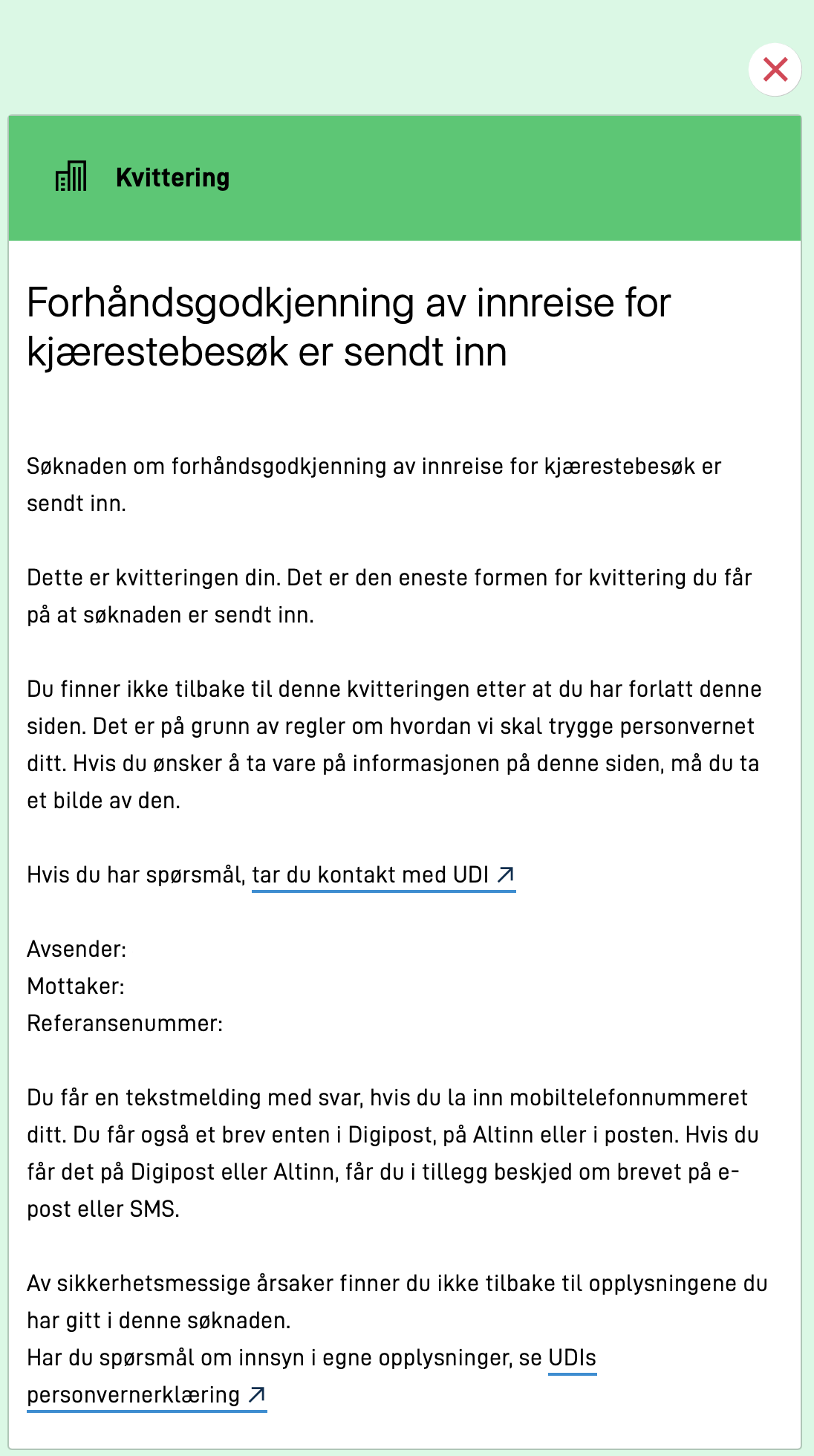 당신은 당신의 남자친구/여자 친구를 위해 노르웨이에 입국할 권리를 신청했습니다.