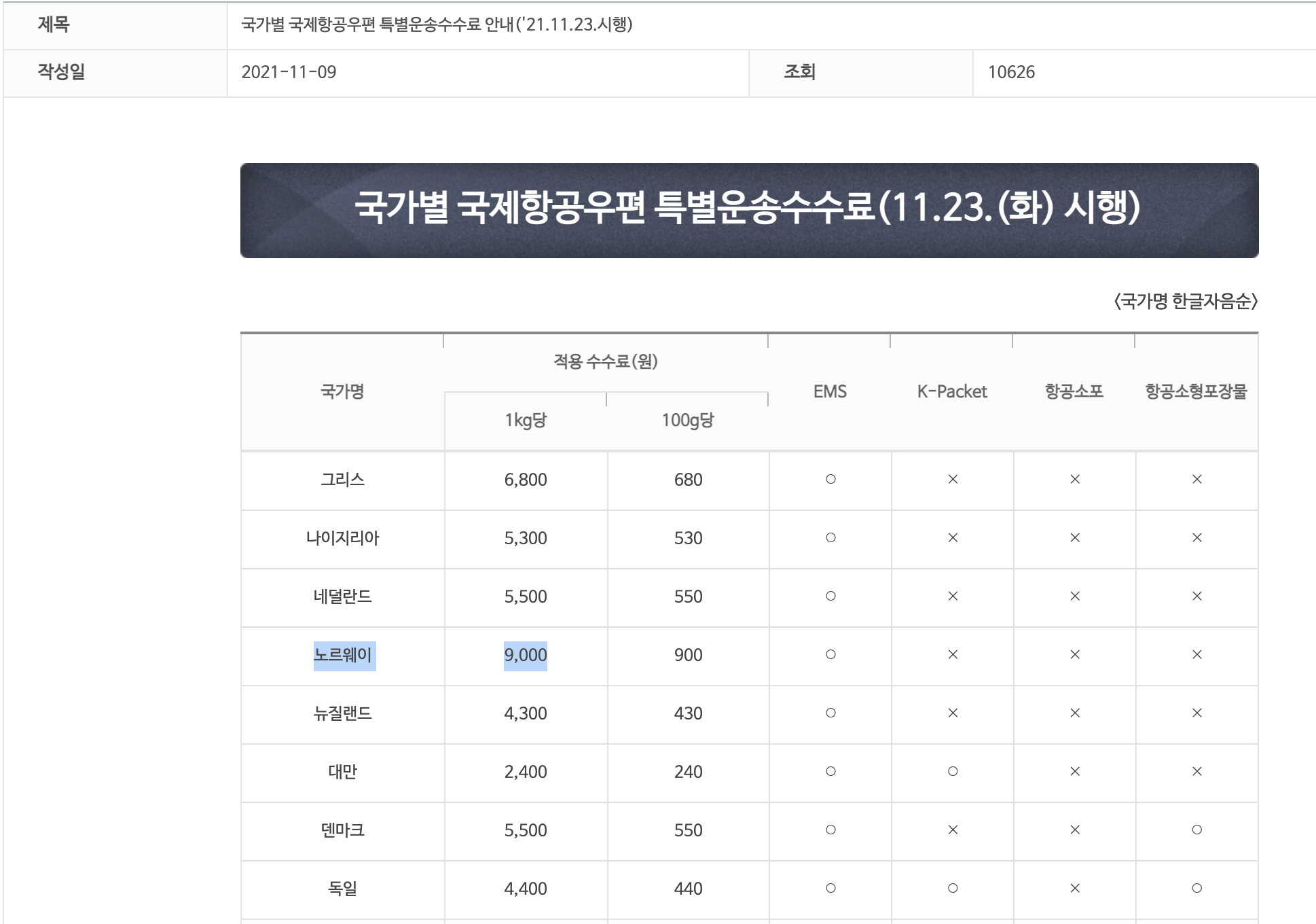 우체국 홈페이지에서 요금표로 봤을 때