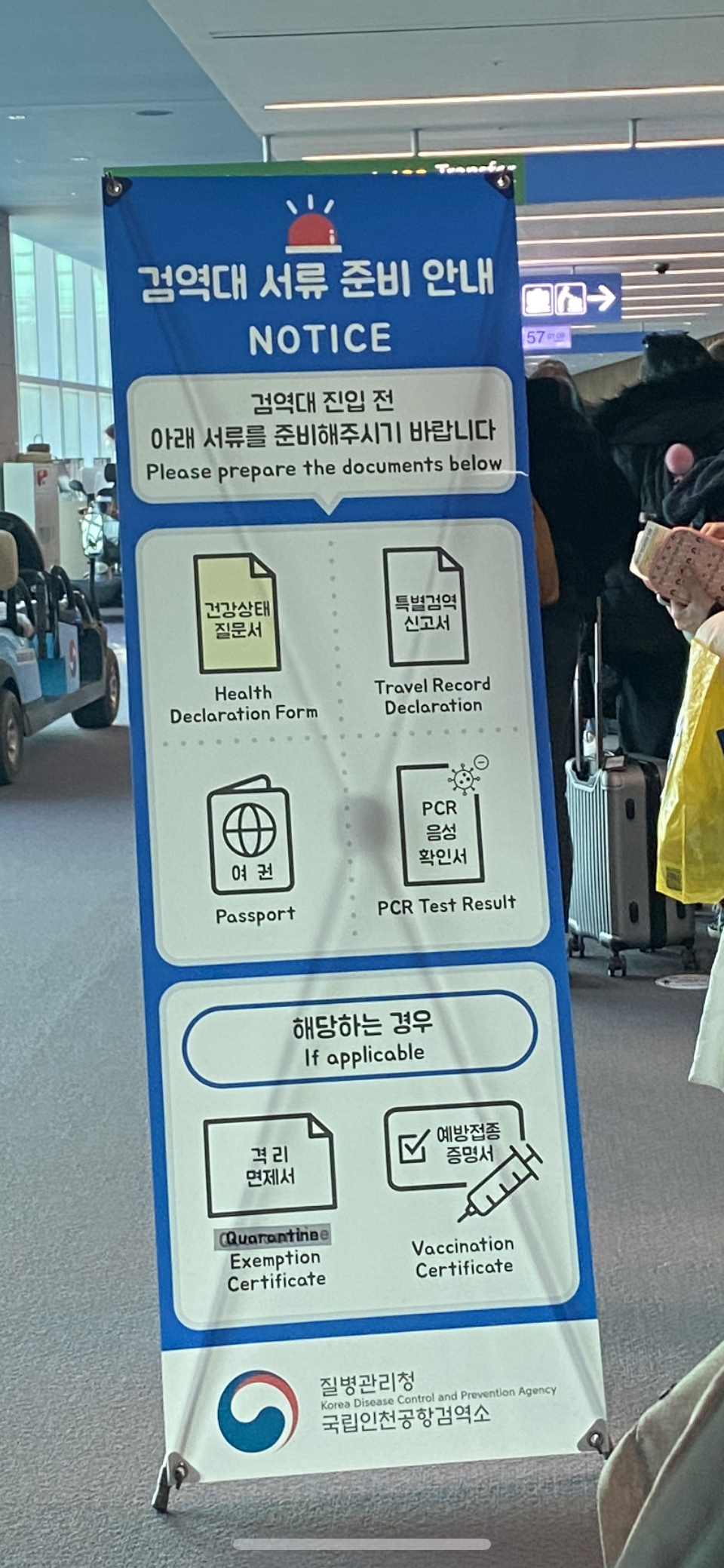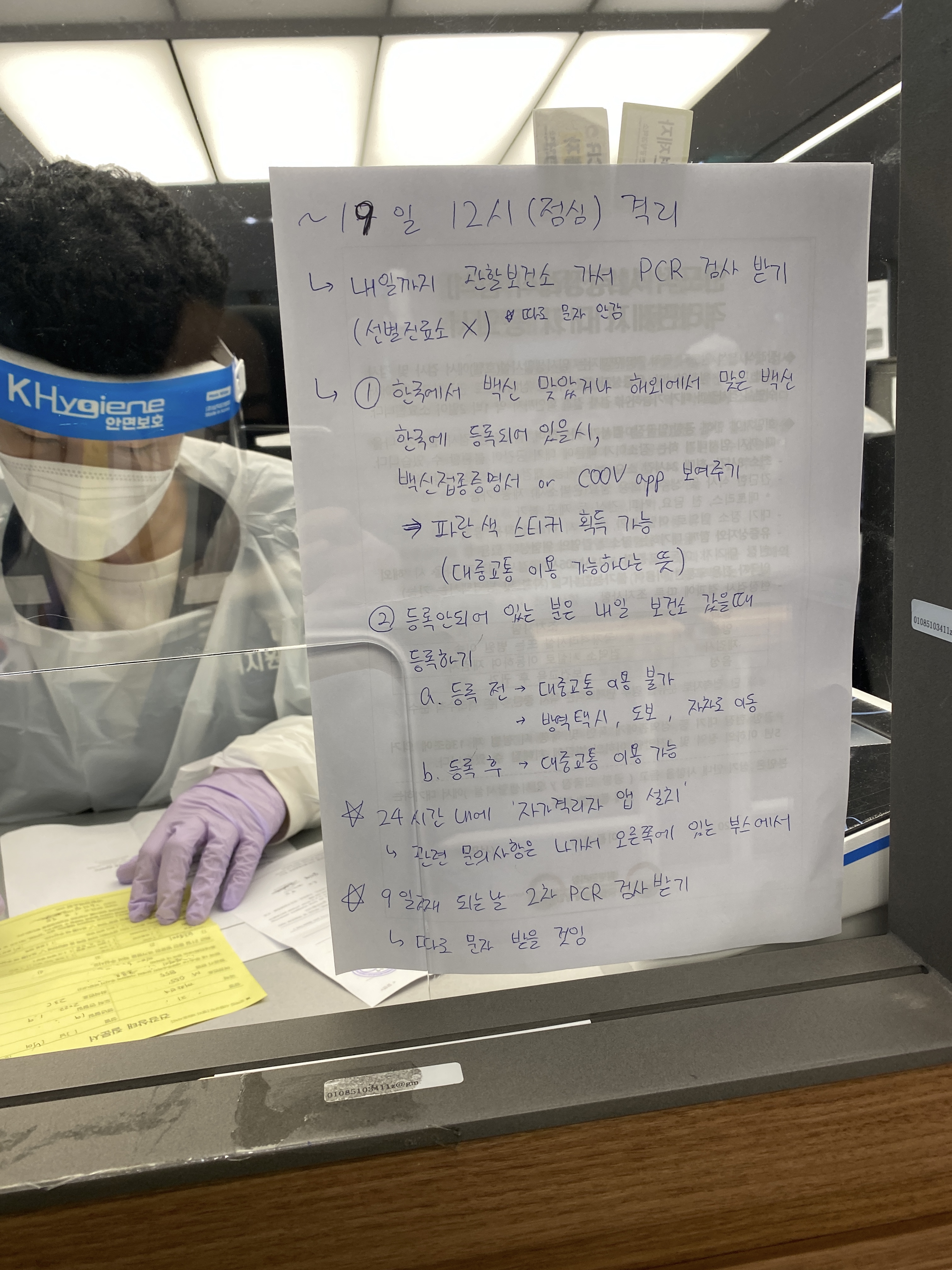 검역대에서 종이2장, 여권, PCR종이를 준비한다