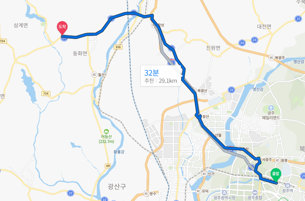 장성 수옥리까지 약 32km를 운전했다. 갈때는 고속도로, 올 때는 국도를 이용했다. 광주역에서 무등경기장 방면으로 가다가 경신여고 방면으로 우회전했다. 그 다음에 문화산부인과에서 벽산블루밍 지나 체육고 쪽으로 우회전 한뒤 비엔날레 다리, 서울방향 고속도로 차선을 탔다. 거의 장성 표지판 나올 때까지 거의 변경하지 않고 그대로 갔다.
