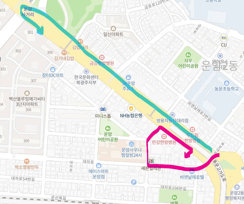 여기서 끝이 아니다. 하아.. 오늘 동운고가~운암사거리를 연습했는데 두드림한방병원 건너편에 주차장이 있다고 가정해보자. 저기를 가기위해서 ⓐ동운고가에서 문화예술회관이 있는 운암사거리까지 갔다가 유턴하는 방법이 있고 ⓑ운암시장으로 진입해서 골목에서 돌아오는 방법이 있다. 아빠는 b를 맹연습 시켰는데 사실 골목운전은 내가 해야하면서도 기피하는 운전이었다. 트럭같은 주정차 때문에 골목이 좁고 반대방향에서 들어오면 곤란하다. 내가 가만히 있어도 상대방이 지나갈 수도 있지만, 내가 '움직여 줘야' 상대방이 나가는 경우도 있는데 그럴 때는 어떻게 할 지를 몰랐다. 아빠가 후진할 때 왼쪽으로 감아라 전진하면서 오른쪽으로 감아라 했는데 머릿속으로 그려지기보다 들리는데로 손을 움직였다. 아무래도 내가 주차를 못해서 그런 것 같다. 하지만 오늘 이후로 좀만 더 연습하면 될 것 같았다.