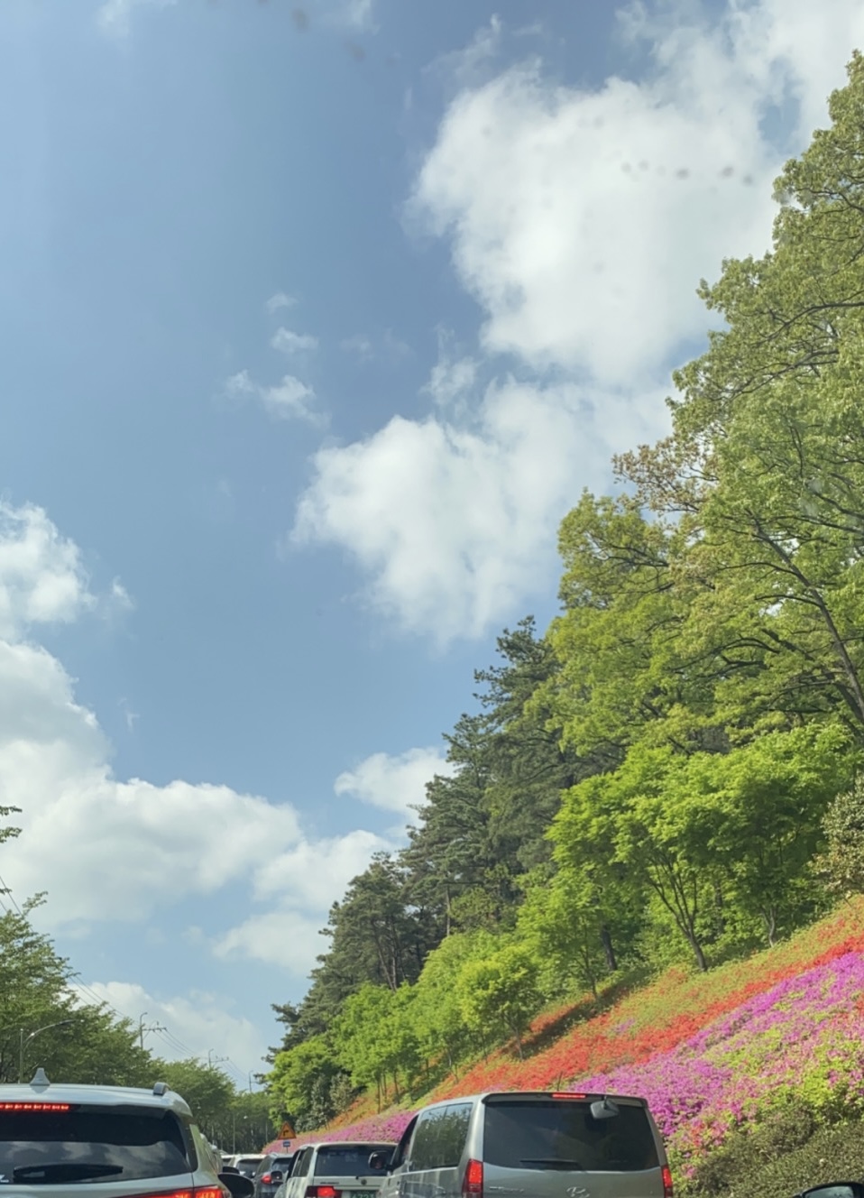 벚꽃이 지고 5월과 가까워지니 색이 더 다채로웠다. 생태숲공원 앞까지는 차가 밀린다. 이 날은 날씨도 좋고 늦게 도착해서 차가 밀렸다. 하지만 막히지 않아도 이 곳은 즐기면서 드라이브 하느라 다들 천천히 가기 때문에 평화로웠다. 공원만 지나면 밀리지 않는다.