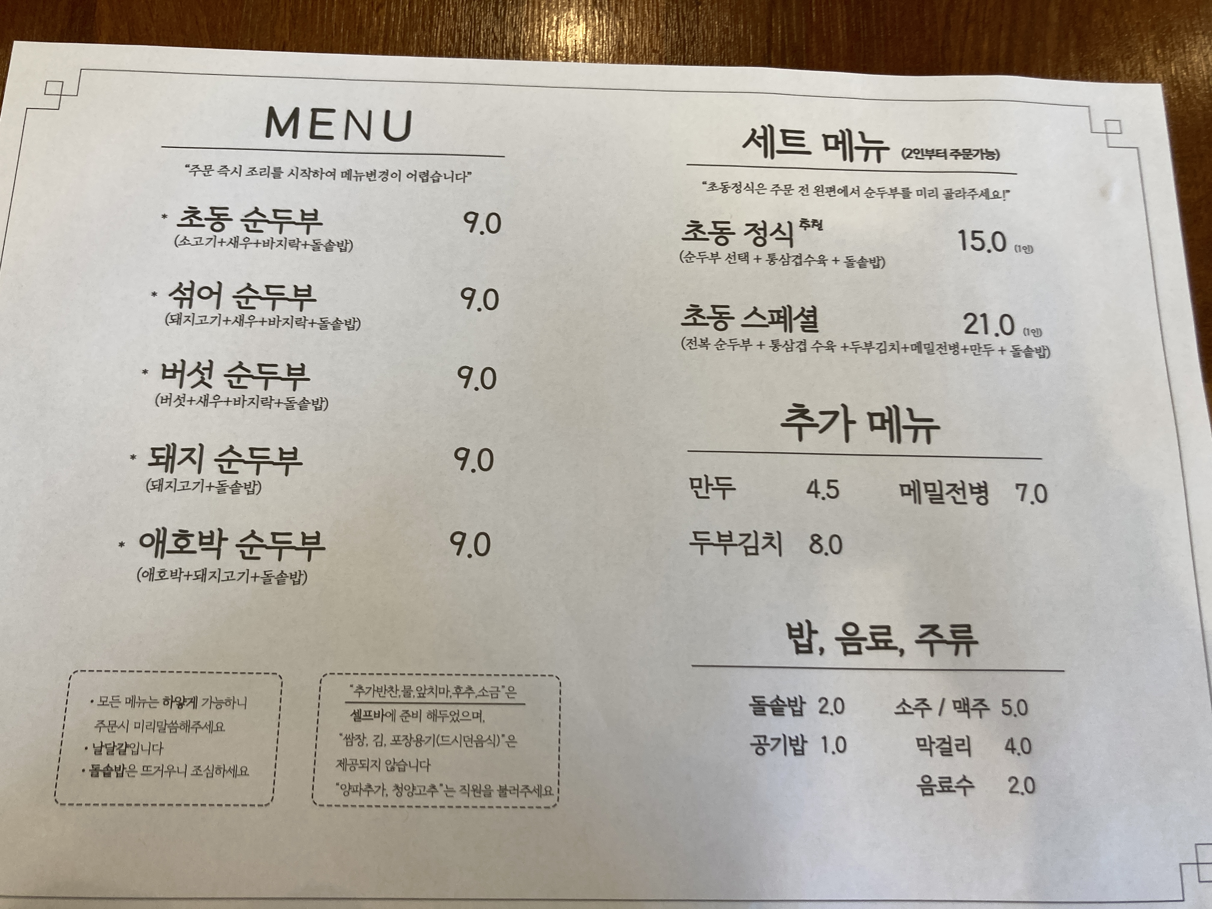 초동순두부 메뉴