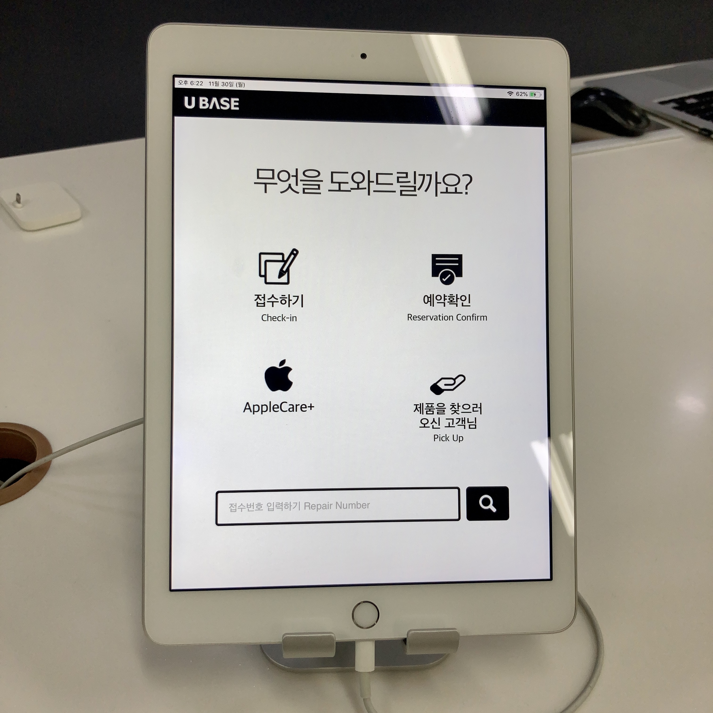 접수하기를 누르고 아이폰/아이패드/맥북/에어팟 중에서 어떤 걸 접수할지 고른다. 에어팟 프로를 누른다. 이름과 주소, 이메일, 증상을 적으면 내 번호표가 뜬다. 내 번호는 543이었다. 오늘은 접수하자마자 바로 번호가 불렸다.