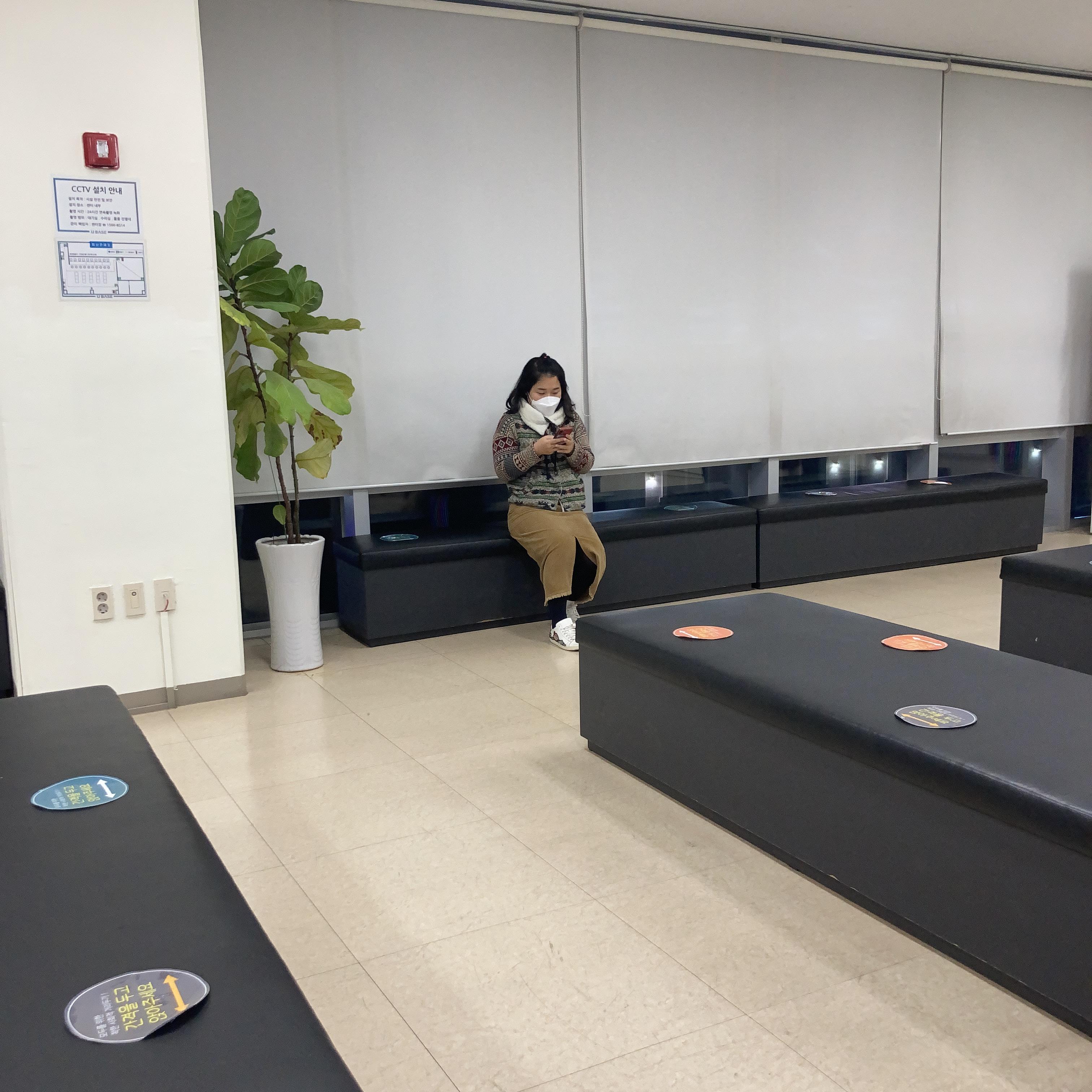 유베이스는 상무자생한방병원 건물 5층에 있는데 같은 주차장을 써도된다. 2시간 무료이다. 평일 오전 10시부터 오후 일곱시까지 업무를 한다. 월요일 저녁이라 사람이 별로 없을거라 생각했다. 들어가자마자 방문 시간(18:18), 전화번호, 사는 지역구, 체온을 기록했다. 어딜가나 방명록을 기록해야하고 손세정제가 비치되어 있다.