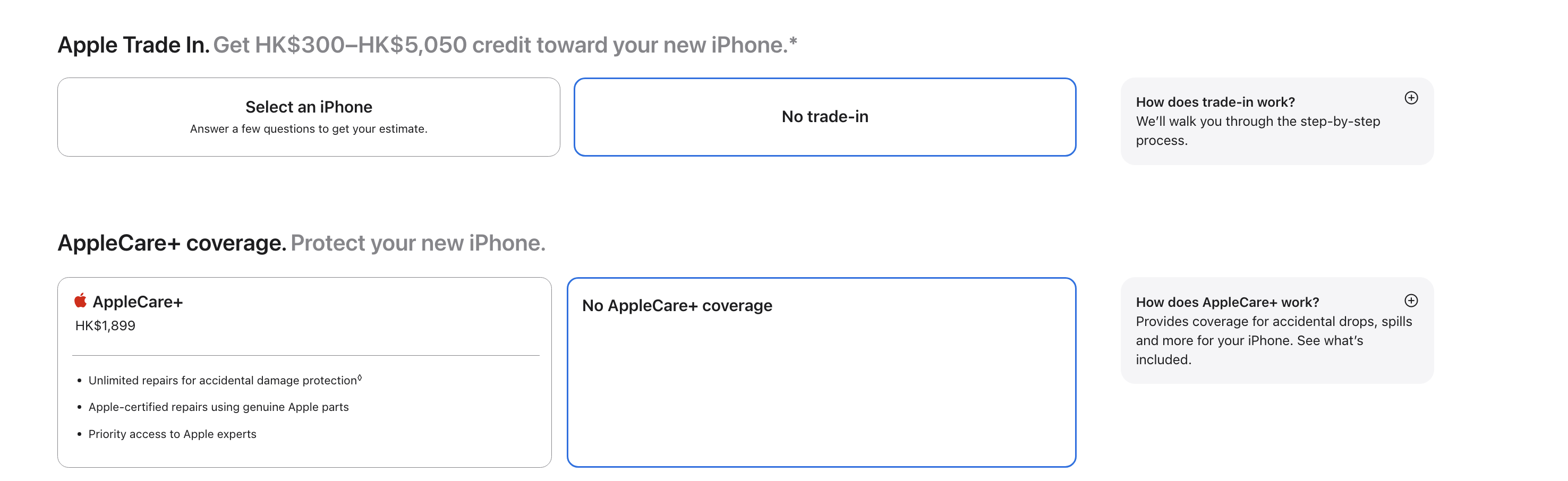 보상판매 트레이드인 안 하고, 애플케어 플러스 선택 안함으로 하면
