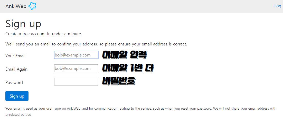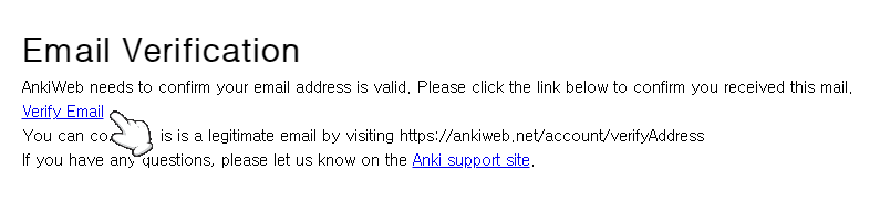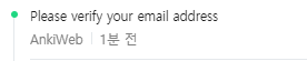 Sign up 을 누르면 Email Sent가 뜨고 인증하라고 뜨는데, 본인의 메일계정으로 로그인해서 받은메일함에 안키웹으로부터 온 "Please verify your email address" 메일을 확인한다.