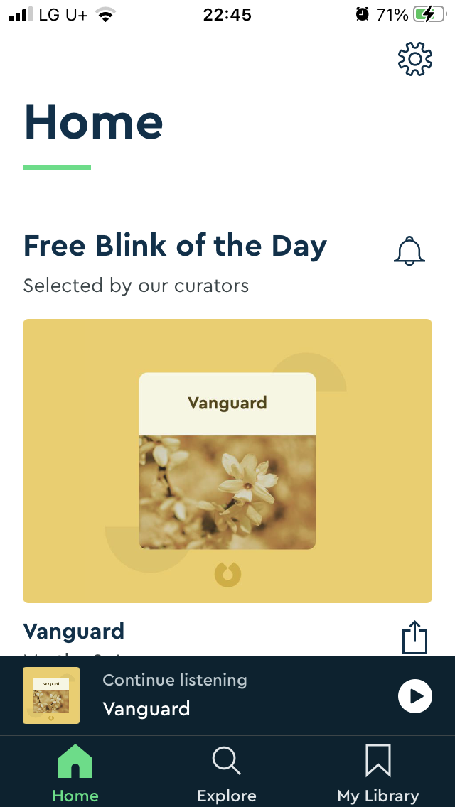 책을 15분안에 요약해주는 Blinkst는 서론에 오늘 어떤 아이디어를 얻어 갈 수 있는지 정치, 인종 또는 다양한 흥미로운 책을 가볍게 정리해준다. 8페이지 정도를 오디오로 재생할 수 있는데 재생속도를 설정 할 수 있어서 영어공부 청취하기에도 정말 도움이 많이 된다. 어플을 매일 1개의 아티클을 무료로 청취할 수 있어서 꼬박꼬박 듣는편이다. 아침 8시에 새 아티클이 도착했다고 알림을 받으면 어플을 킨다.
