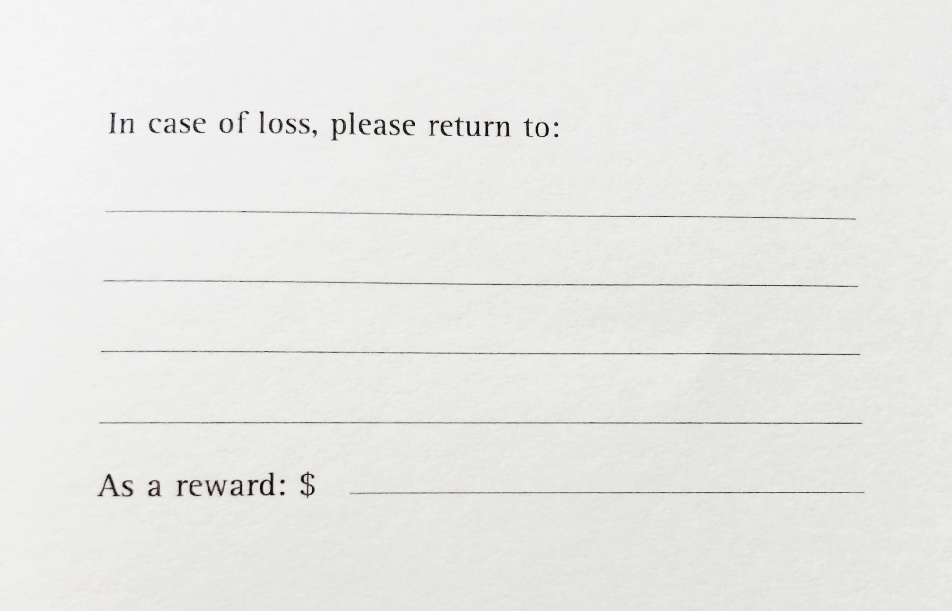 첫 장을 열면 만약에 잃어 버릴 때를 대비해서 인적사항을 적는 칸이 있다. 사례는 얼마를 약속하겠다고 금액을 써놓기도 하나보다.