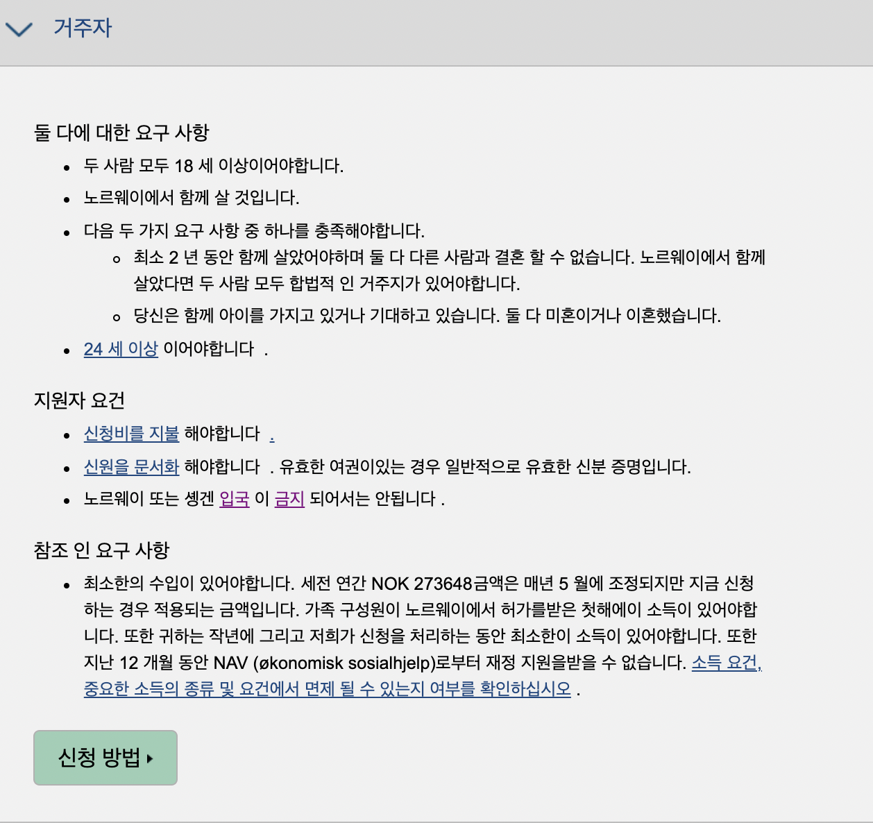 최소 2년간 같이 살았고 가족 구성원, 즉 노르웨이인 거주인이 2년간 세전 연봉 자금을 입증해야한다.