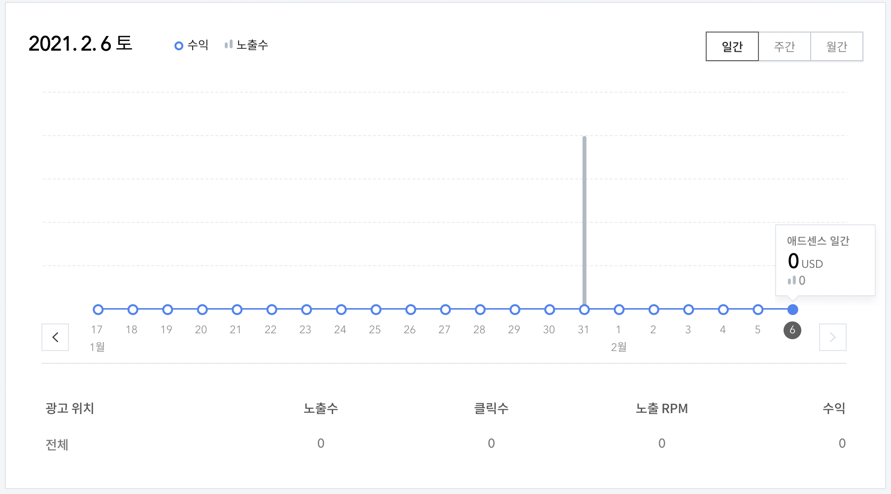 광고 게재 제한이 적용된 1월 17일부터 2월 6일까지 광고 수익은 0이었다. 그동안 쭉 꺼놨는데 31일만 저런 이유가 있다.